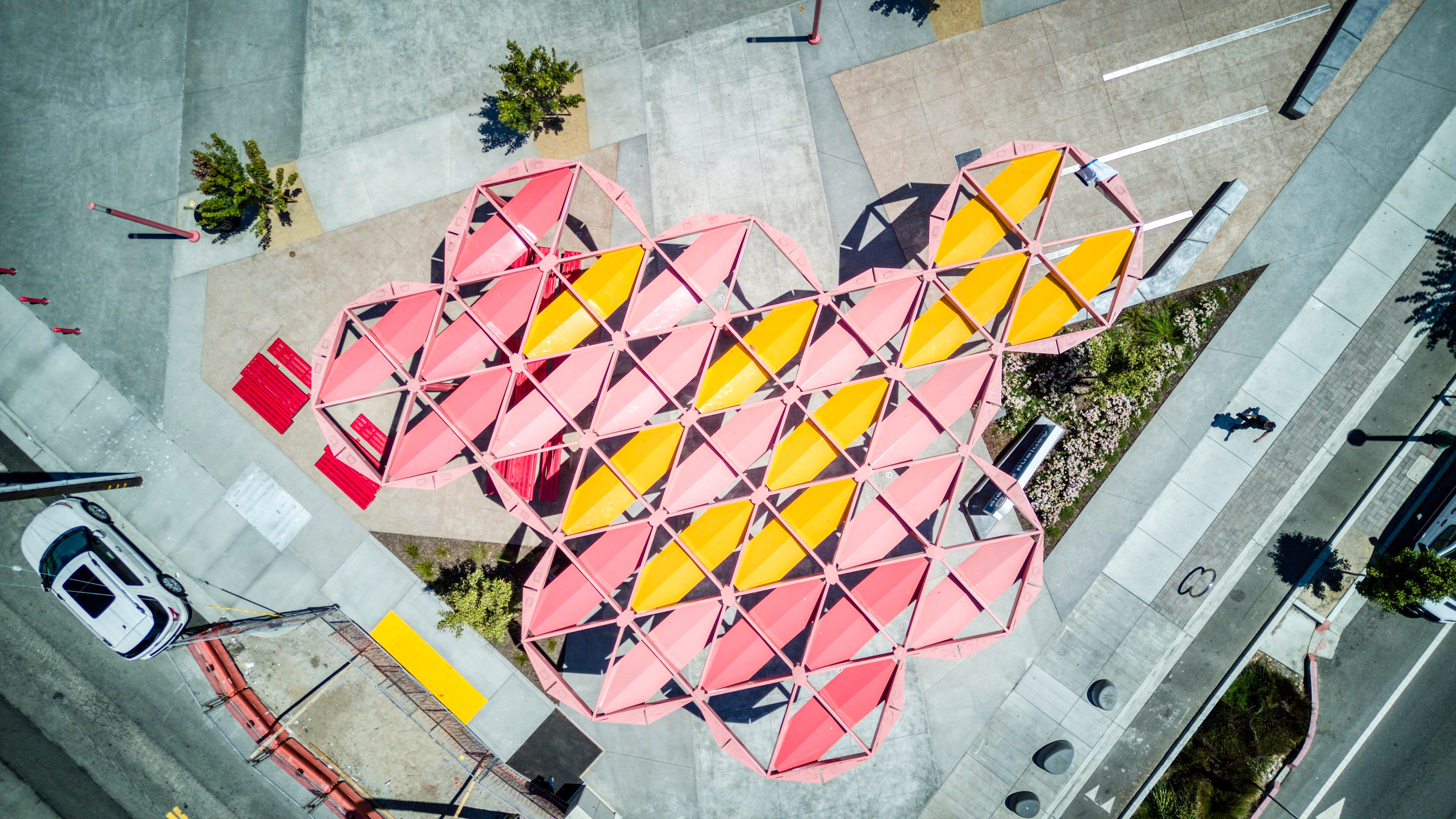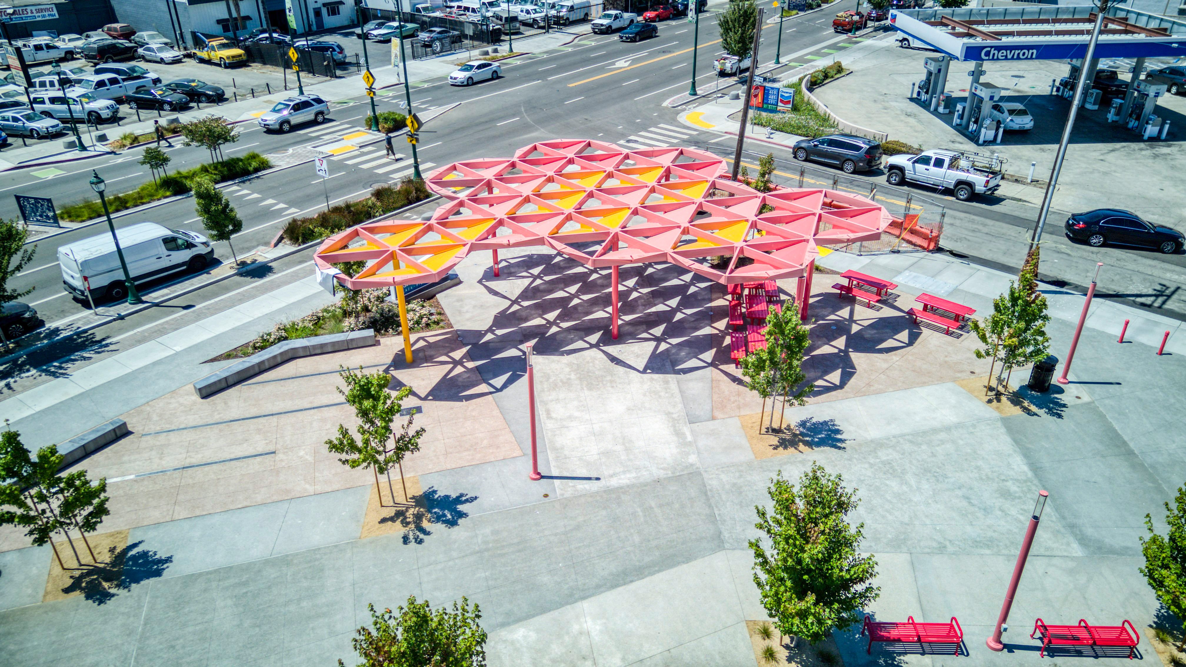 The result is a distinctive shade structure inspired by nature, featuring a geometric canopy that echoes the organic patterns of tree foliage. The vibrant, powder-coated steel framework provides both visual appeal and lasting durability.