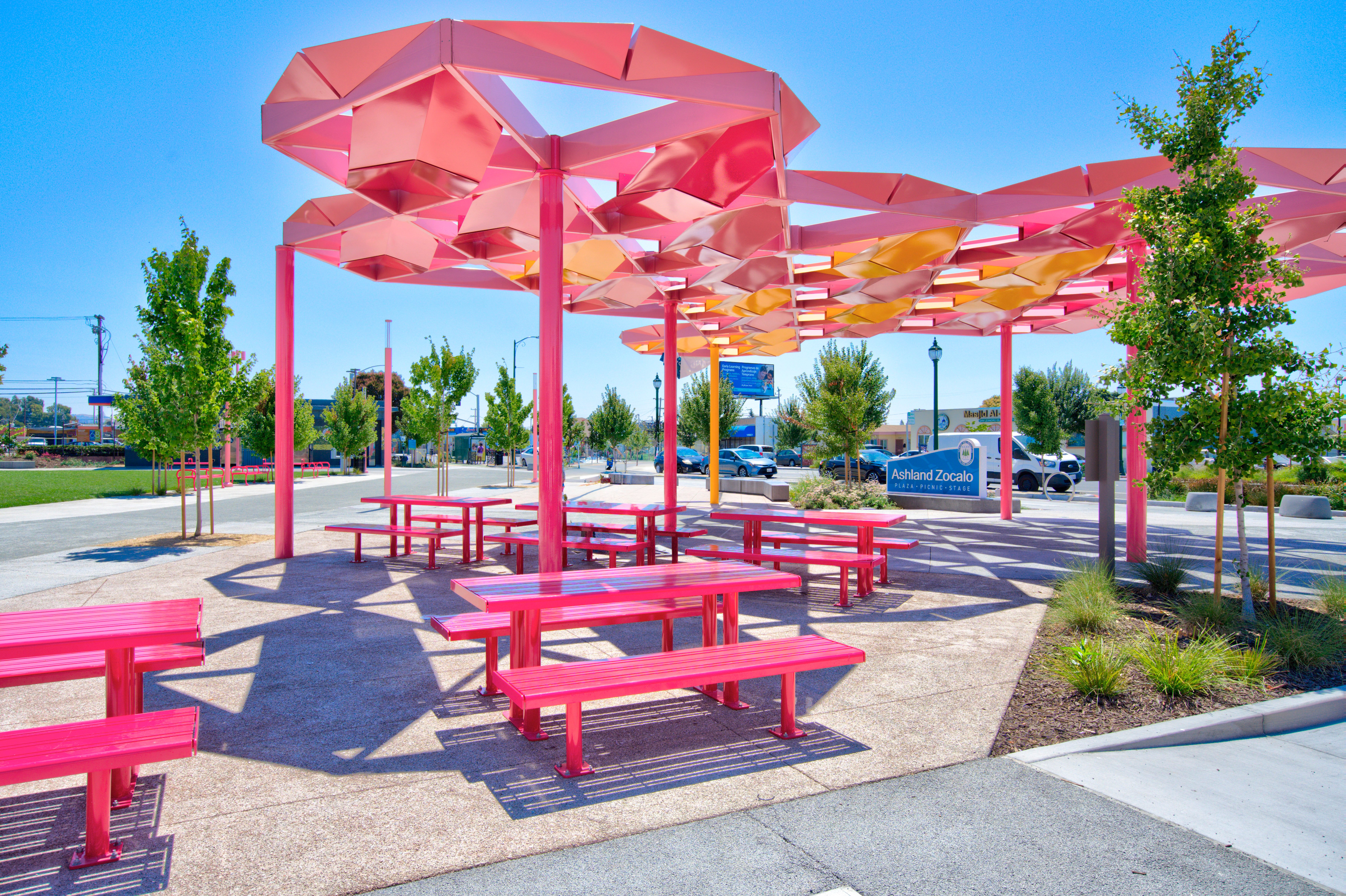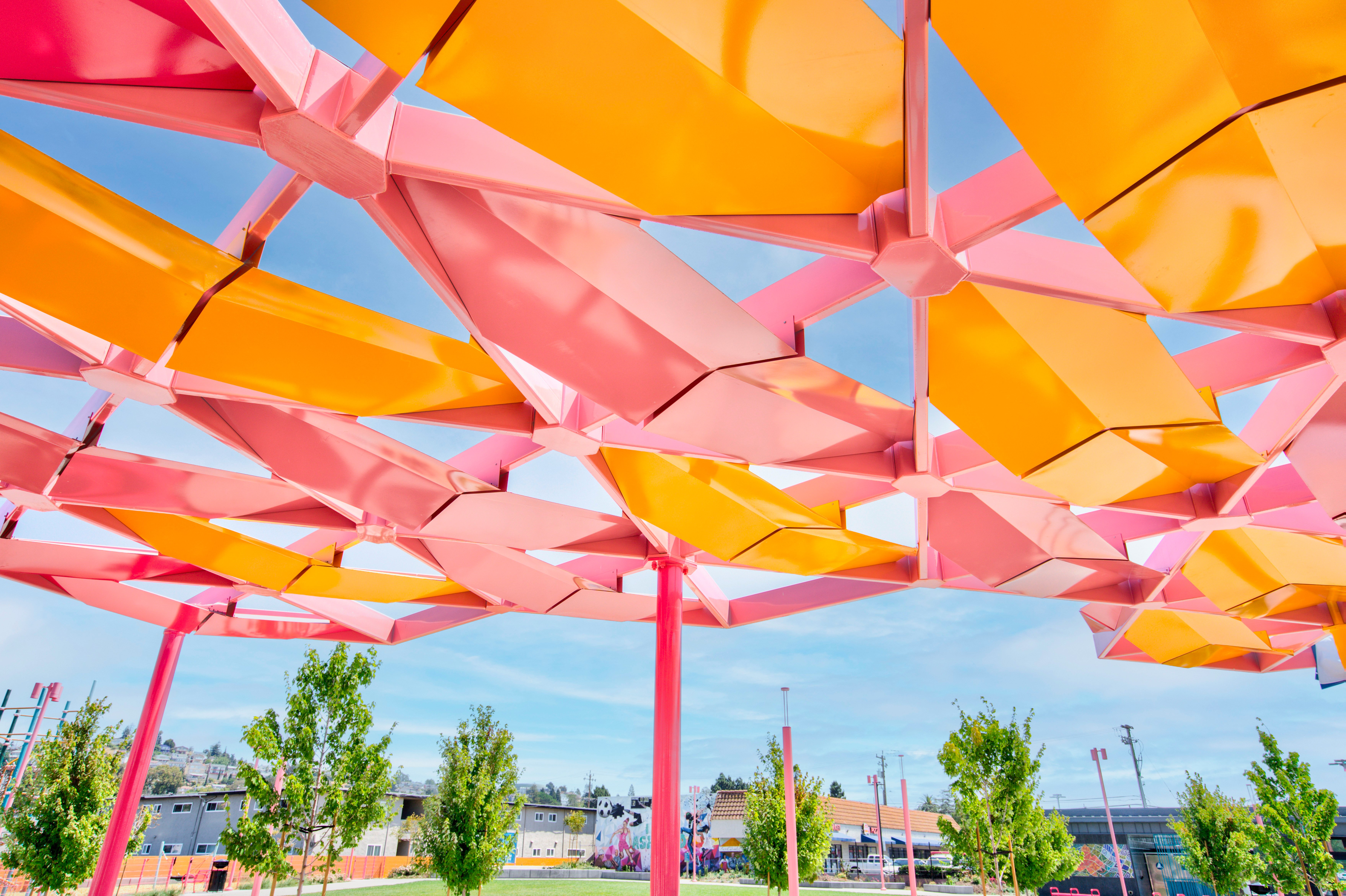 Shelters don’t have to be ordinary—this bold pink and orange structure makes a statement, drawing attention and adding dynamic visual interest to the environment.