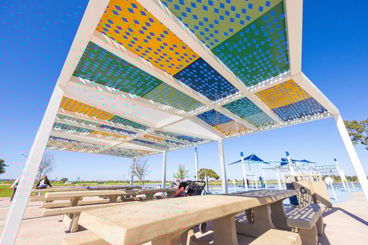For the Tecolote Shores Park project, it was necessary to ensure that the new structure blended well with the existing playground. To achieve this, we used the colors found on the playground in the custom laser cut panels. This shelter allows for a shady place to hang out while also giving a distinctive shadow on the ground below. The outcome was a visually cohesive structure that blended in seamlessly with the playground's surroundings.